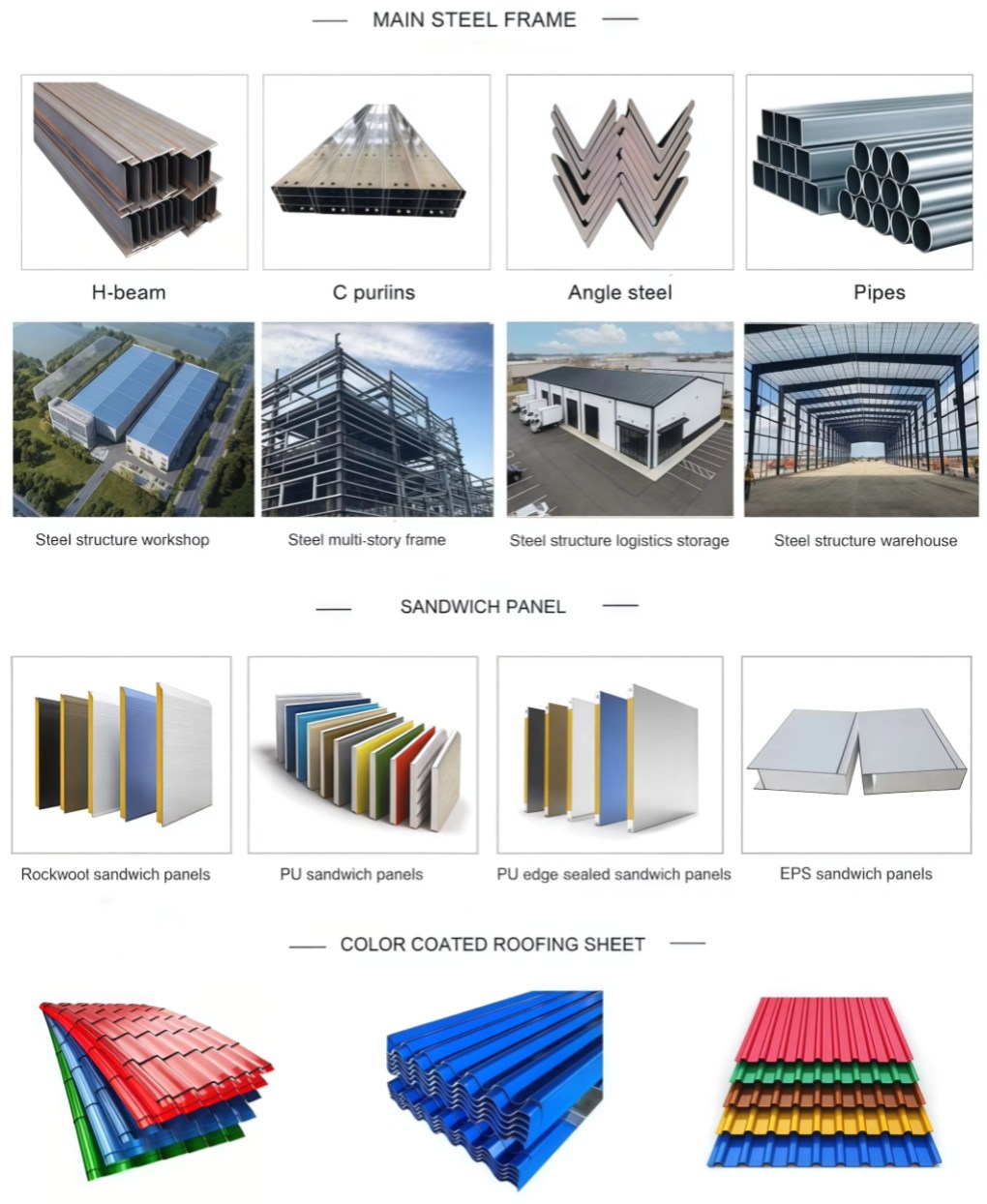 8. Roof and Wall: determine the panel material, such as color steel panel, and metal sandwich panel.
